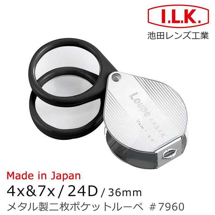 產品特色.鏡面直徑為 36mm 光學玻璃鏡片,外殼使用堅固又高質感的金屬材質,可保護鏡片以增加使用壽命。.雙鏡式設計,單片4倍、兩片疊合為7倍,可因應各種細小物件進行觀察。(7倍時請以單隻眼睛觀看).體積小巧,方便隨身攜帶,後端附有吊飾孔洞,可自行搭配各種皮繩、鍊條作為吊飾或頸掛。.Made in Japan 日本製造,不論是送禮或自用皆宜。實際拍攝