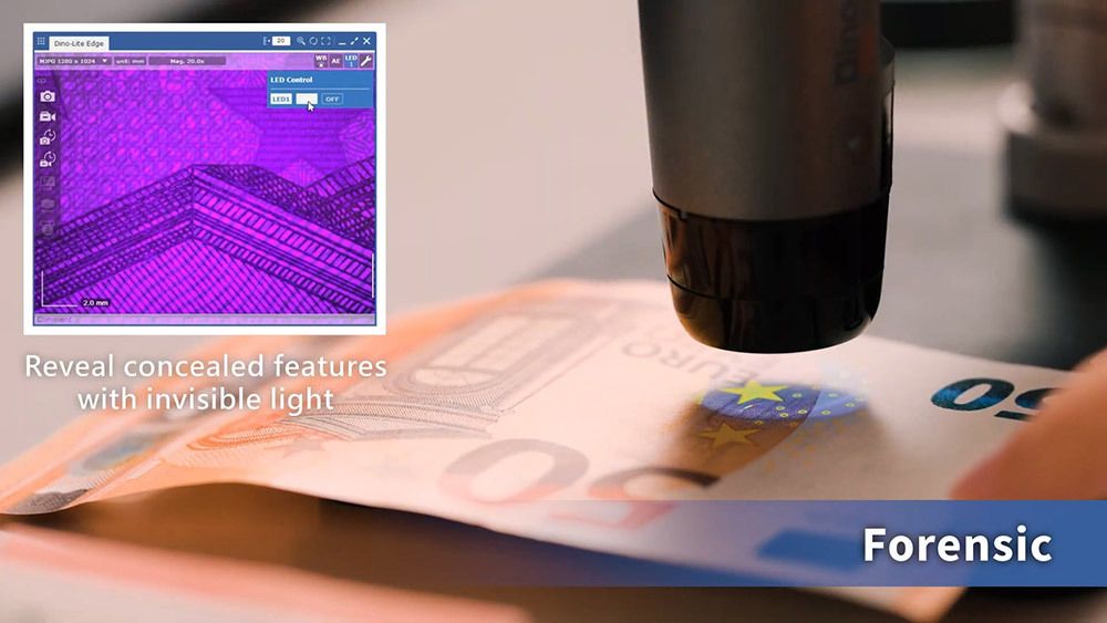 FUW 款式為 375nm UV紫外線顯微鏡,並可切換為白光 LED 進行比對,可用於:UV油墨辨識、重要文件辨識、真偽鈔辨識、PCB電容漏液檢查、礦物內含物觀察、玉石翡翠注膠染色鑑定、玻璃錫面(Tin Side)/空氣面(Air Side)分辨、鑽石螢光反應(Strong Blue)、古畫作補筆修復。內建 MicroTouch 微觸碰開關,預設為拍照鍵,也可於軟體內自訂熱鍵功能。雙段式可調光罩,支援多種觀察角度與對焦距離。
