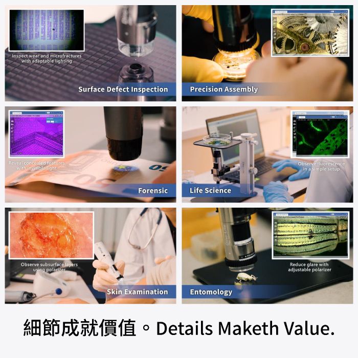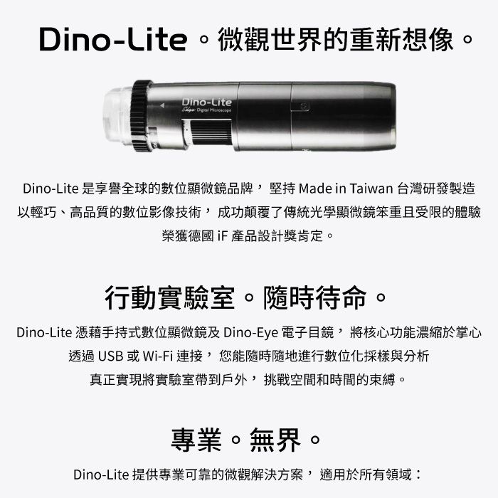Dino-Lite 秉持創新精神,打造新世代專業級顯微解決方案,全面滿足產業現場、科學研究、醫療檢測與教育訓練等多元場域的高端需求。全系列產品皆為 Made in Taiwan 台灣研發製造,堅持品質與技術同步國際,並通過 AFAQ ISO 14064-1 國際溫室氣體盤查驗證,實踐永續環保與企業責任。產品特色800萬畫素: 細緻呈現,清晰非凡